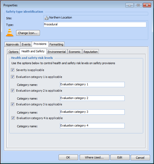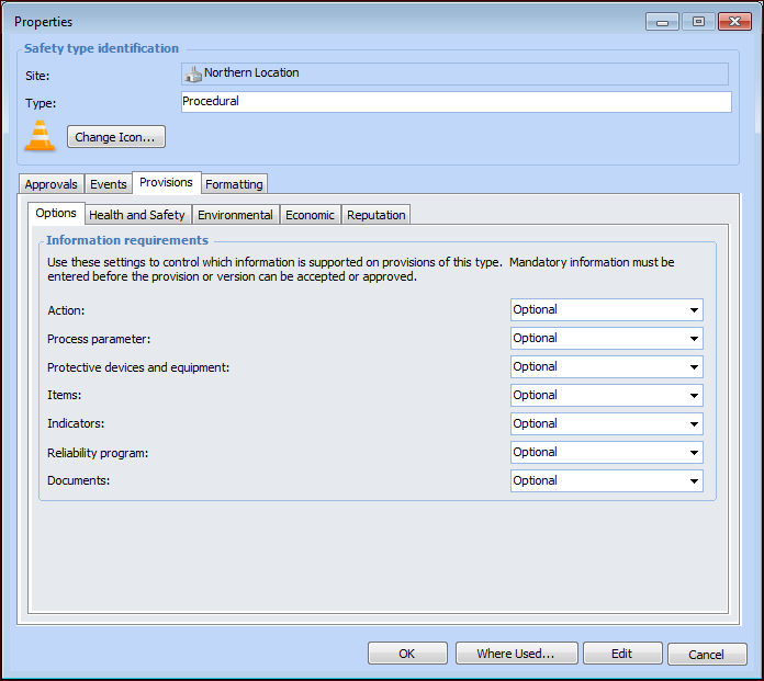 12. Depending on the settings on the Options tab, a type of information can be mandatory, optional, or unavailable. Mandatory information must be included in the provision before it can be approved or marked as accepted. If a type of information is unavailable, its tab does not appear in the Safety Provision Version window. Select the appropriate options: