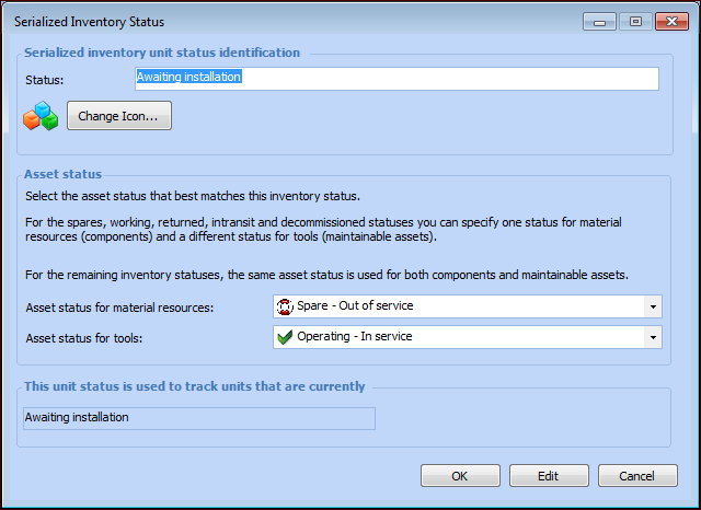 • Before you begin defining the inventory statuses, you should ensure that appropriate asset statuses exist in the system. To define asset statuses, please see **Setting up Asset Statuses.For more information about defining unit statuses, see Setting up Serialized Inventory Unit Statuses for Repairable Spares.To Define Serialized Inventory Unit Statuses