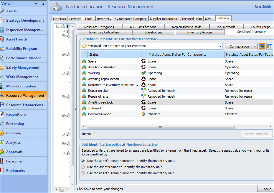 2. Select the Serialized Inventory tab. This tab lists the serialized unit statuses and the default asset statuses. For example: