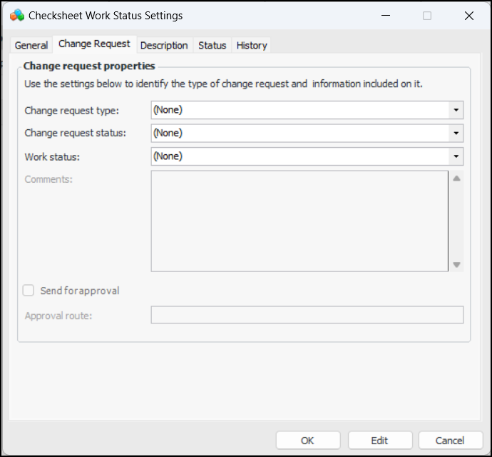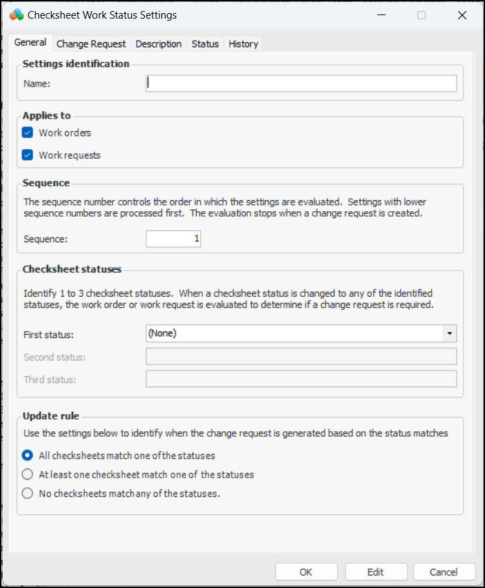 3. Click New. The Checksheet Work Status Settings dialog appears: