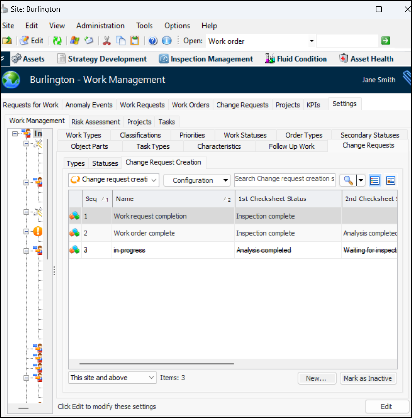 2. Select the Change Requests tab and then the Change Request Creation tab. This tab lists the change request creation settings for the site:Tip: While settings are being developed, you can mark them as inactive to prevent them from being selected. When you are ready to enable the settings, select it in the table and click Mark as Active.