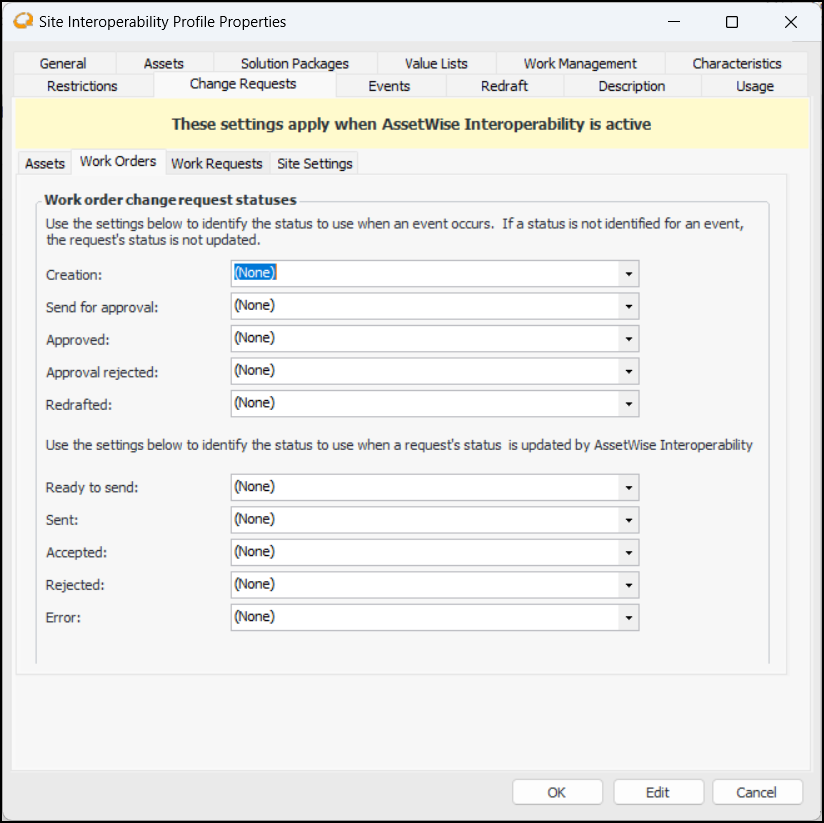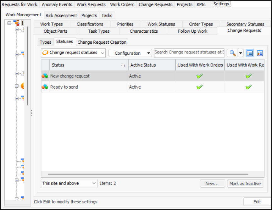 Tip: To view work document change requests and their statuses, select the Site window, Work Management view, and the Change Requests tab.To Set up an Asset Change Request Status