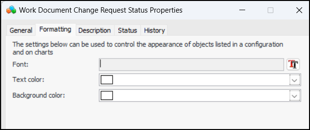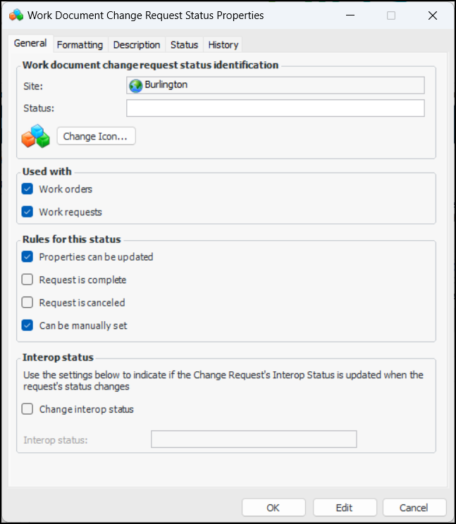 3. Click New. The Work Document Change Request Status Properties dialog appears: