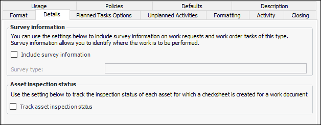7. In the Survey information area, select Include survey information and then select a survey type from the list, to display survey information on the work request or work order task.In the Asset inspection status area, you can turn on the option that will track the inspection statuses for each asset for which a checksheet is created for a work document (APM work order task or interop work order). Possible inspection statuses are: