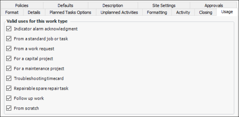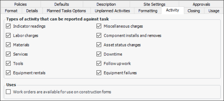 When this option is selected, the Failures Resolved tab is available on the Activity Report dialog for work order tasks that use this type.When this option is cleared, the Failures Resolved tab is not available on the Activity Report dialog. Users might still be able to report equipment failures in other ways.In the Uses area, you can allow work documents (work order tasks or interop work orders) with this work type to be used on construction forms. For example, in the Construction Form window, the Work order selection list contains only objects with work types that support construction forms.