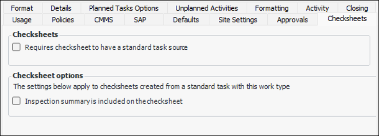 Select this option to include the Inspection tab on standard tasks and work order tasks using this work type. This tab allows you to plan a list of indicators to read for the task and, on work order tasks, to view any indicator snapshots taken during the task’s life cycle.
