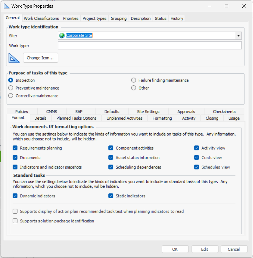 You can use these options to simplify work orders and standard tasks that have certain work types. When you remove any of the options from the work type, the resulting work order task and standard task do not display that information. You can remove any of the following: planning information, standard documents, indicators and indicator snapshots, component activities, asset status information, scheduling dependencies, Activity view, Costs view, Schedules view, and Survey information.Work Type Defaults