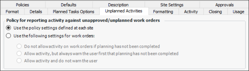 9. On the General tab, Unplanned Activities tab, you can override the site’s unplanned work order policy setting on an individual work type. You can also select the types of activities that can be reported on activity reports for tasks using this work type: