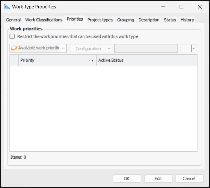 You can restrict the work priorities available for use with a work type. In the Work Type window, the Priorities tab is available when AWEIS is active and feature 131 is enabled. The work priorities that are available for selection are filtered on assets, standard tasks, checksheets, and requests for work.Note: The restricted work priorities feature is generally available in APM. You must first enable feature 131 to use the functionality. In the Enterprise window, select the Features view and the Enabled Features tab. Click Browse, select “Provide the ability to limit the priorities that can be used by a work type” and click OK. If APM is running as a smart client, click Refresh Enabled Features on the server. Then restart the client to use the functionality.Project Types