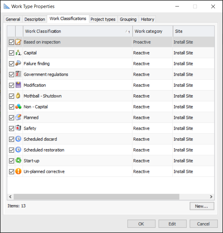 18. Select the Work Classifications tab:Tip: To create a classification, click New. For more information about creating classifications, see Setting up Work Classifications.