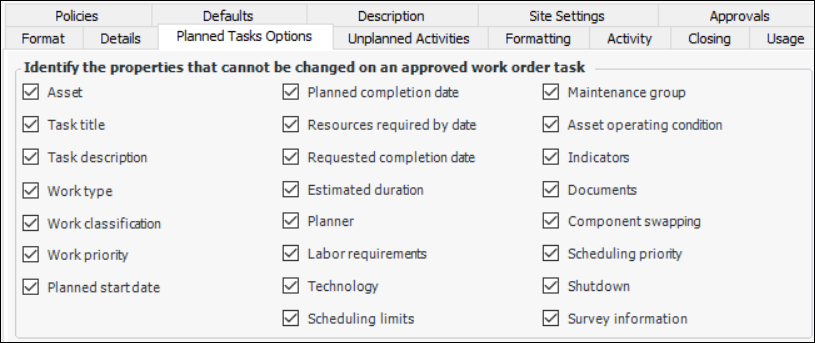 8. On the General tab, Planned Tasks Options tab, you can select which properties can be changed on approved work order tasks of this type. All options are selected by default:
