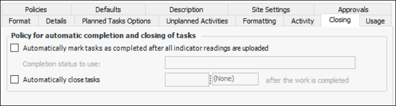 12. On the General tab, select the Closing tab to set the policy for automatic completion and closing of tasks: