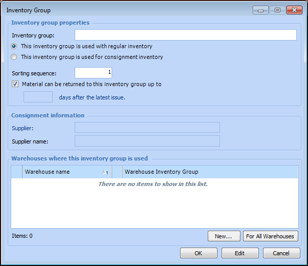 7. If your warehouses are already set up, you can choose which ones this inventory group should be linked to. To select a warehouse click New. The Warehouse Inventory Group dialog appears. Select the appropriate Warehouse and click OK.To link this inventory group to all of the warehouses in your system, click For All Warehouses.