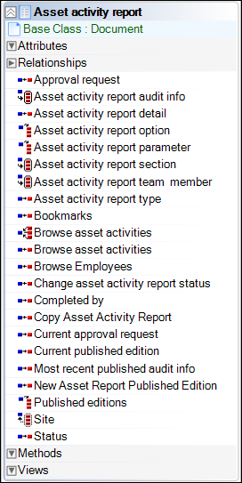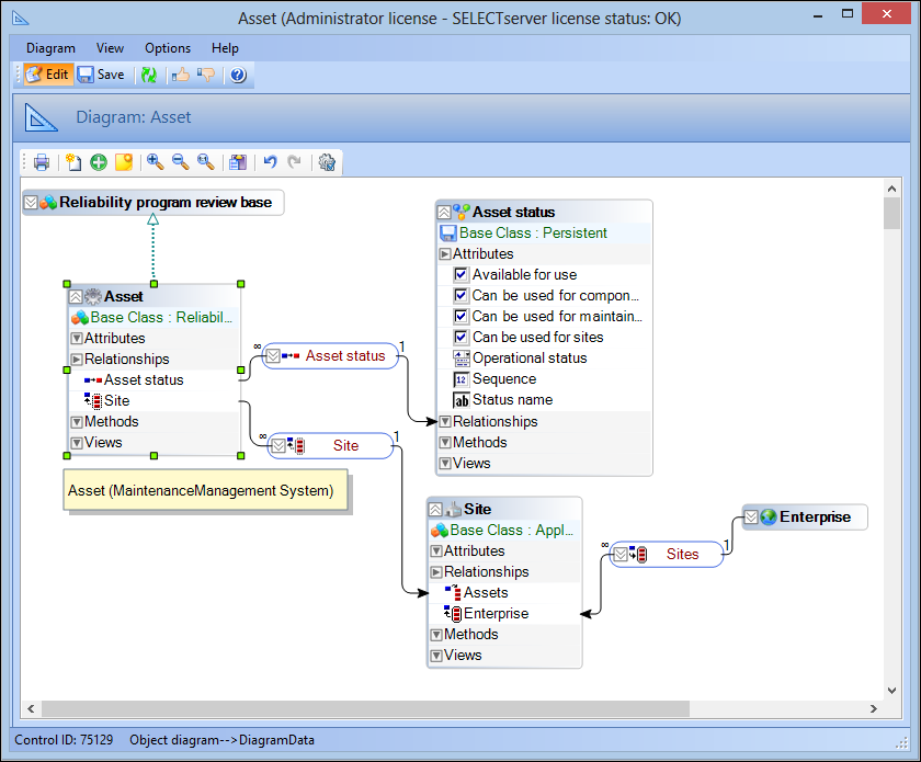 In addition to the line itself, the relationship also indicates if the relationship is one-one or many-many. Each type of relationship is identified by a specific icon. For more information about types of relationships, see Relationship Types. When a relationship is displayed in an object model diagram, either a “1” or a “∞” appears at each end of the relationship, to denote a single or multiple relationship respectively.
