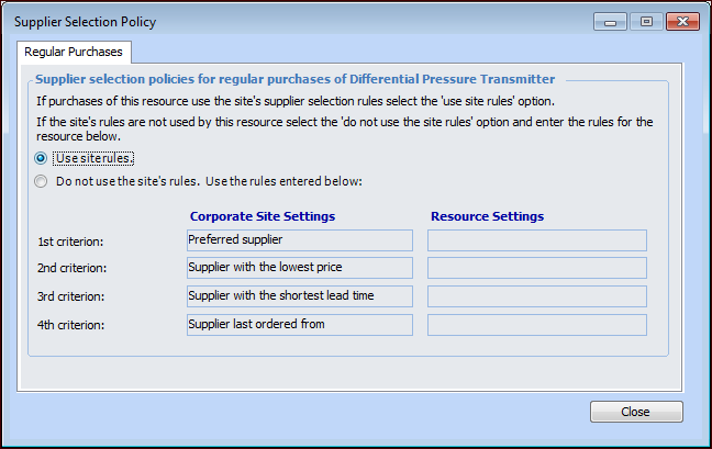 3. In the Supplier Selection Policies area, click Details. The Supplier Selection Policy dialog appears. For example: