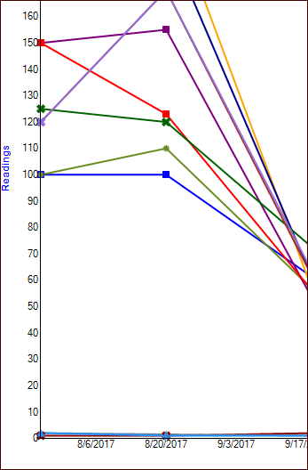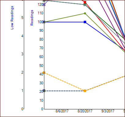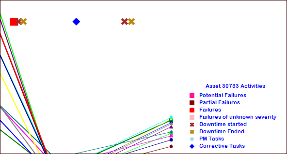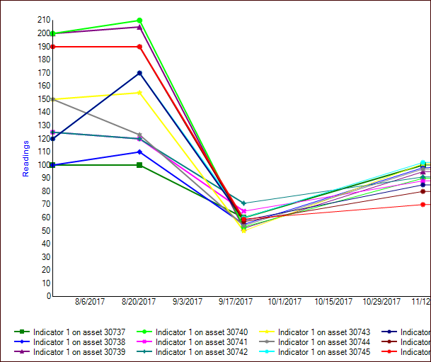 Analysis tab shows a graph of the indicator readings collected over the time period that you selected. The legend at the bottom of the graph shows each indicator’s name, asset, color, and shape for reading occurrences. Here is an excerpt from a basic analysis: