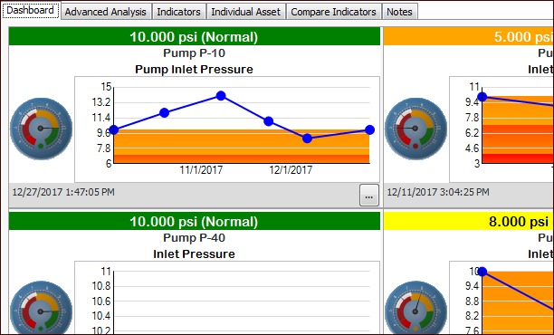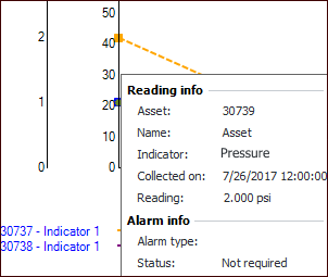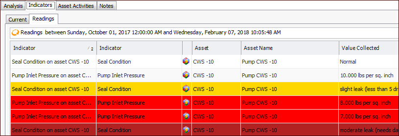 Readings tab. This tab lists the readings by indicator and includes each indicator’s asset, value collected, and collection date and time.