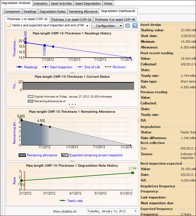 Comparison tab displays a graph of readings that occurred during the designated time period, as well as the degradation reading values, next inspection dates, and end-of-life dates. For example: