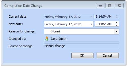 When you change the planned completion date, select the reason that you are changing the date. The list of reasons is set up in the Work Management settings under the site’s Administration menu.Note: There might be limitations on the completion date that can be entered for a task if scheduling relationships have been entered for the task. See Scheduling Relationships.To Change the Planned Completion Date for a Work Order Task