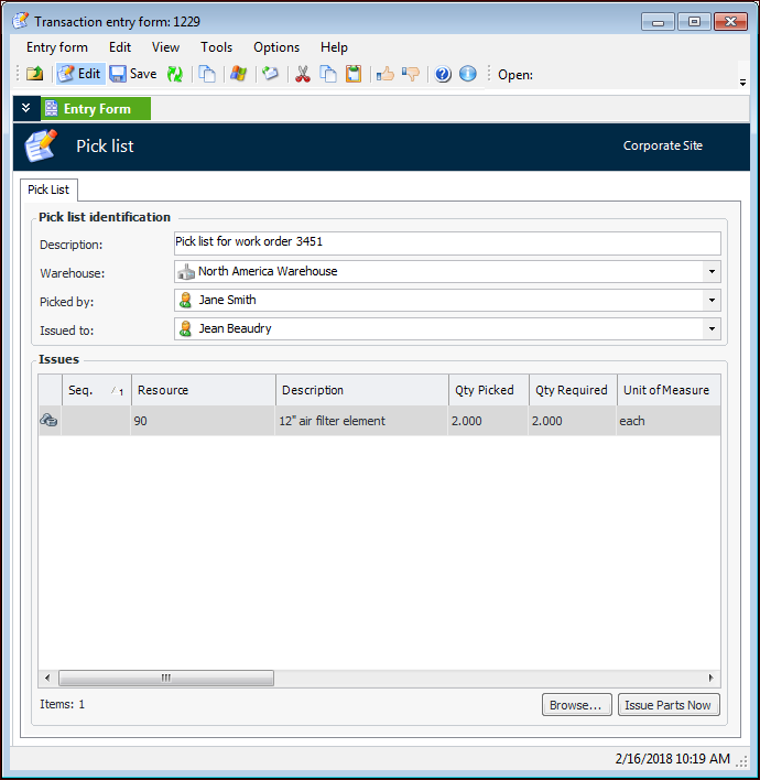 Note: If the work order has a requirement for a serialized resource, and the unit has not yet been selected, this requirement will not be added to the pick list. To issue a unit, see Issuing Serialized Units.To Create a Pick List and Issue Parts