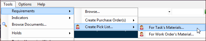 • To create a pick list for the open work order task: Open the Work Order Task window, click the Tools menu, Requirements, Create Pick List, and then For Task’s Materials.
