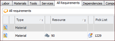 3. Open the Work Order Task window, select the Planning tab and the appropriate requirement tab. Scroll to the Pick List column in the table. The column displays the icon and number for the pick list. For example: