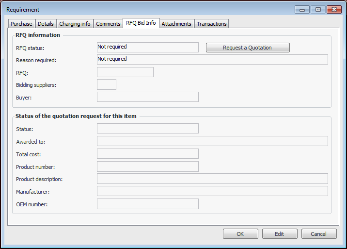 4. Select the RFQ Bid Info tab. The RFQ Status box states whether or not an RFQ has been requested. For example:
