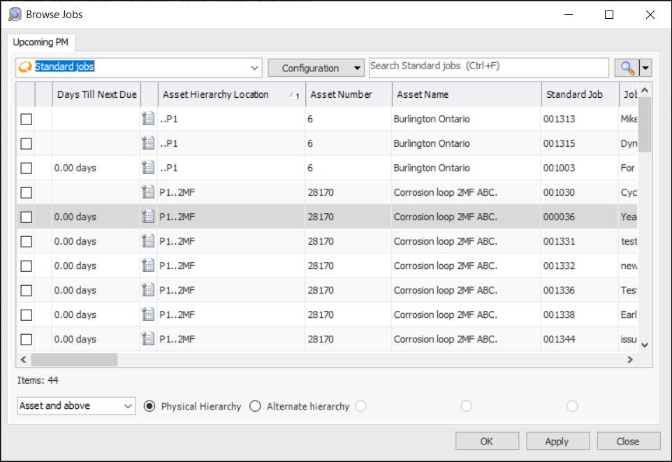 5. Select the jobs you wish to add and click OK. APM adds the standard tasks listed on each of the standard jobs to the work order.