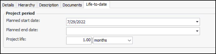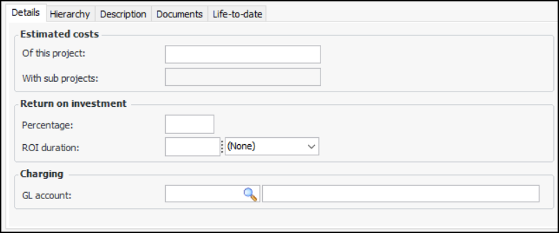 Note: This information is visible if the project type allows project details. If this tab is hidden, you can enable it if you have the required security profile. For more information, see Setting up Project Types.To Define Estimated Cost, Project Life, and ROI