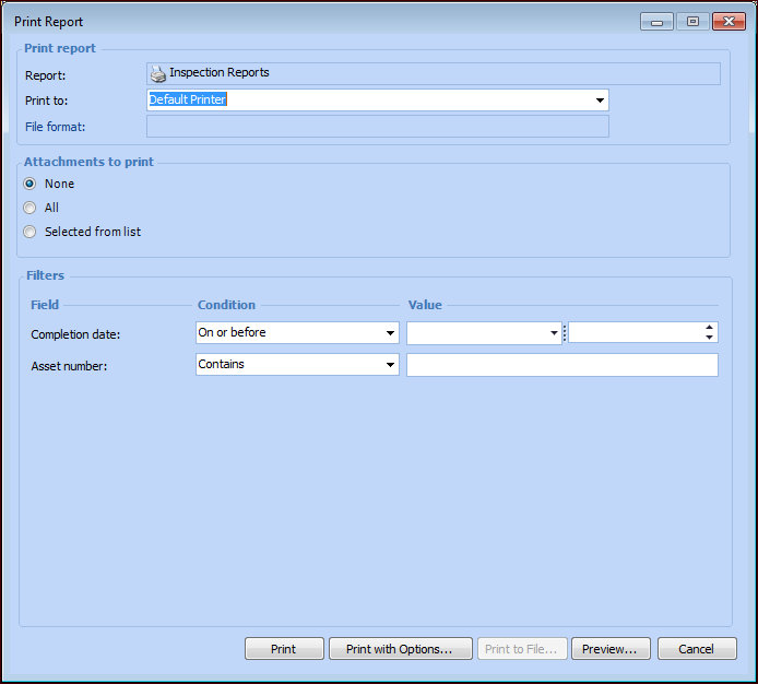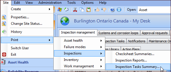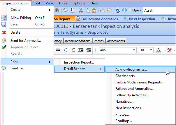• To print reports for an asset, open the Asset window, click the Asset menu, Print, and then Inspection Reports