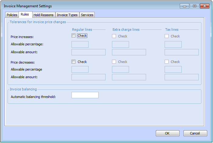 • Amount: the amount by which the invoice line can differ from the expected line price based on the purchase order price and quantity being invoiced.Note: In order to enter price tolerances for extra charge and tax lines, you must first enable approvals for these lines in the site’s Approval Settings dialog. See Setting up Invoicing and Credit Memo Approvals.To Set the Price Tolerances for a Site