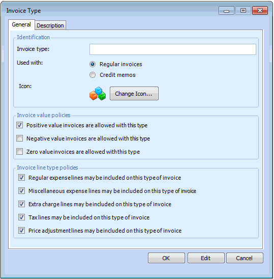 4. On the General tab, enter a name for the invoice type, select whether this type is used for regular invoices or credit memos.