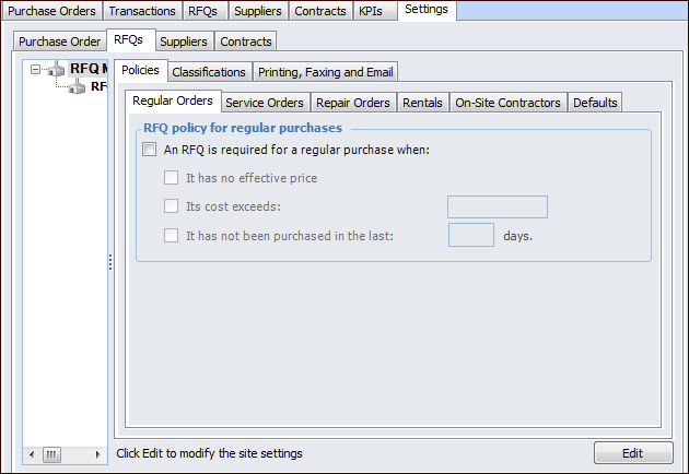 1. From the Site window, select the Purchasing view, the Settings tab, and then the RFQs tab. Select the RFQ Management Settings node in the tree.
