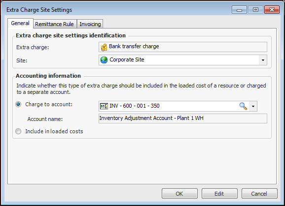 10. For each of the sites that require settings, click New. The Extra Chart Site Settings dialog appears, showing the settings that you set up in the Extra Charge Properties dialog. For example: