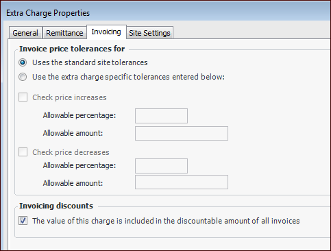 Select whether this extra charge uses the site’s price tolerance rules for invoicing or if specific price tolerances are required. To set up price tolerances specific to this extra charge, select Use the extra charge specific tolerances entered below and then enter the appropriate tolerances for price increases and/or decreases.