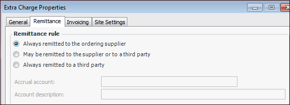 • Always remitted to a third party: Select this option if the extra charge is always remitted to a third party, and it is never paid to the ordering supplier. You must also select an accrual account for this extra charge.