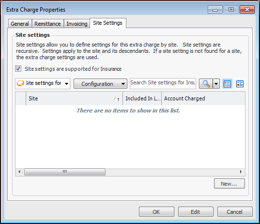 9. To define settings specific to a site, select the Site Settings tab. Click Site settings are supported for.Note: You might have to click Edit twice to save the extra charge policies and enable the New button.