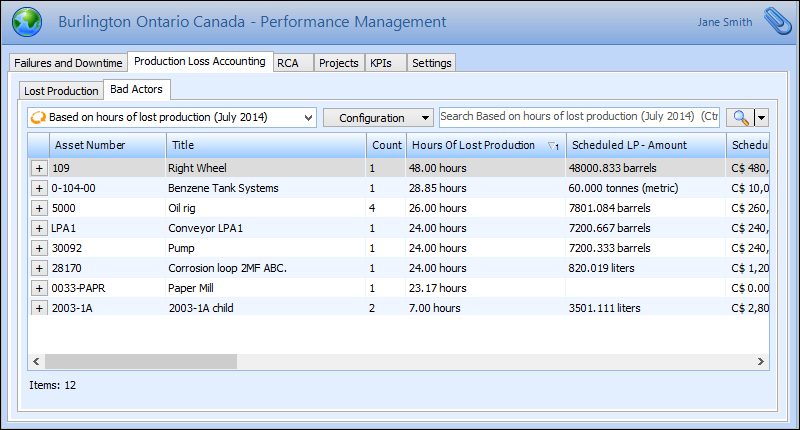 2. On the Bad Actors tab, you can select from several configurations to view current and previous month summaries of the assets that contributed to the lost production. For example: