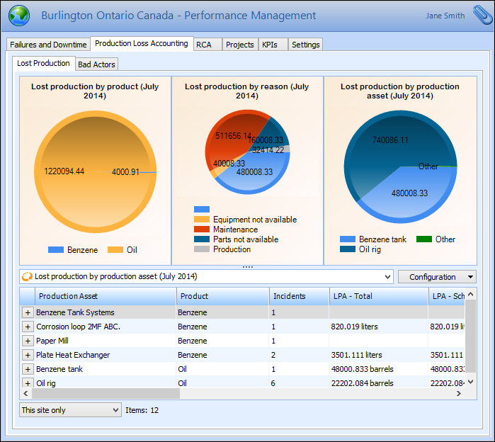 1. From the Site window, select the Performance Management view, Production Loss Accounting tab, and then the Lost Production tab. A summary of lost production data is displayed. For example: