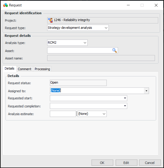 6. Click OK. The Strategy Development Analysis window appears, where you can develop the analysis. The request status changes to “Processed”.To Cancel or Reopen an Analysis Request