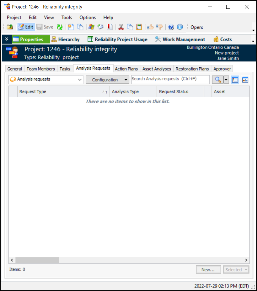 • On the Site window, select the Performance Management view, Projects tab, Analysis Requests tab. The default configuration for this tab is “Open analysis requests”.