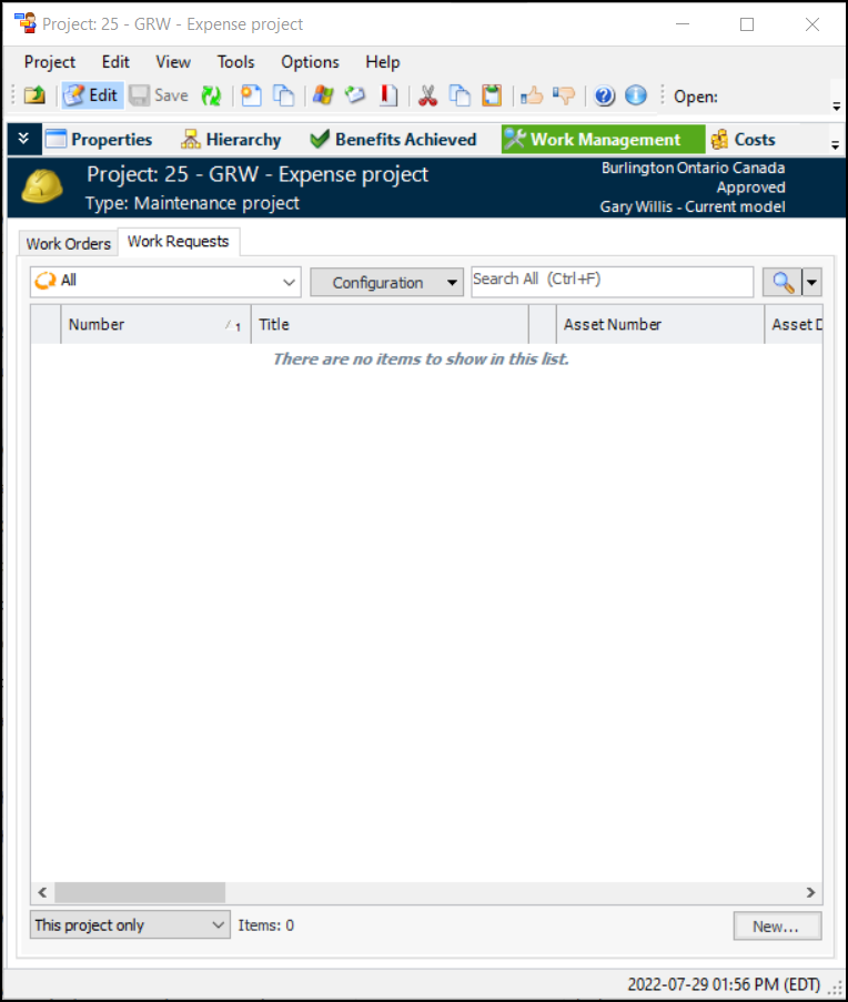 This topic explains how to create a work request from a project and add the WBS. For detailed information about creating work requests, see Creating a Work Request.Tip: Work requests can also be created from the site, asset, or anywhere you can create a work request. Simply reference the project on the work request (Properties view, Project tab).To Create a Work Request for a Project