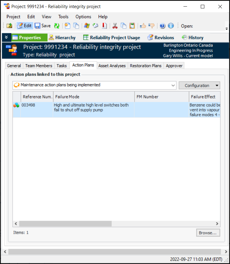1. In the Project window, select the Properties view, Action Plans tab. This tab lists the maintenance action plans that have been linked to the project.
