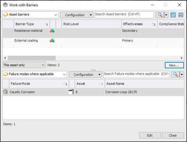 • Select Asset Barriers to work with barriers assigned to the failure mode’s asset. This option is useful if the failure mode’s asset is not the primary asset of the RBI analysis.
