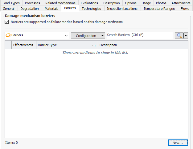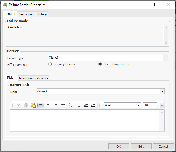 1. In the Failure Mode window, select the Barriers tab. A barrier is a means of slowing or mitigating asset degradation. For example, coating, lining, and chemical treatment are used to slow corrosion in metal piping.Note: To prevent barriers from being selected on failure modes created from the library entry, clear Barriers are supported.