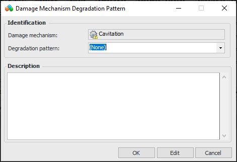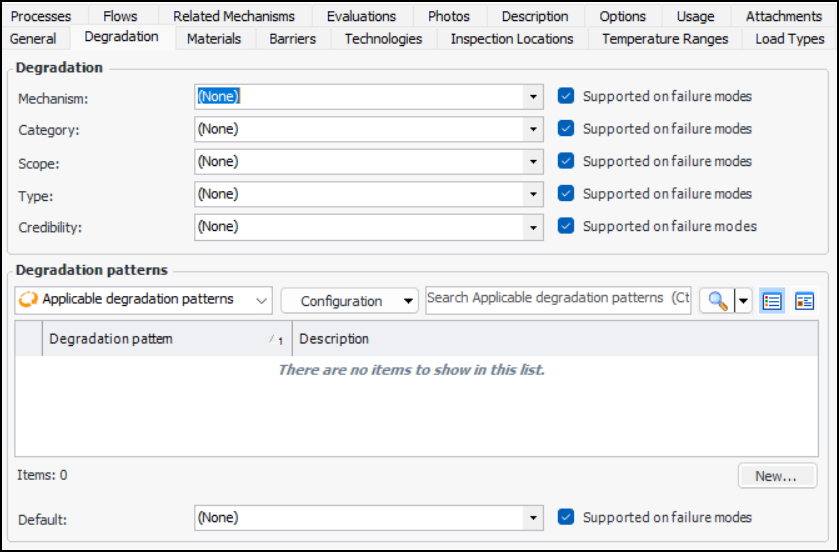 Note: If degradation patterns are not supported on failure modes for this damage mechanism, clear the Supported on failure modes option. Skip to To Select Materials Information.For each pattern, click New. The Damage Mechanism Degradation Pattern dialog appears: