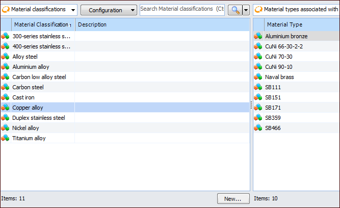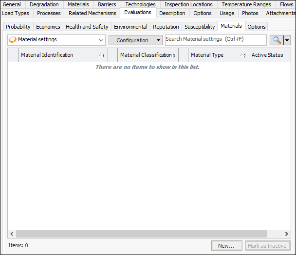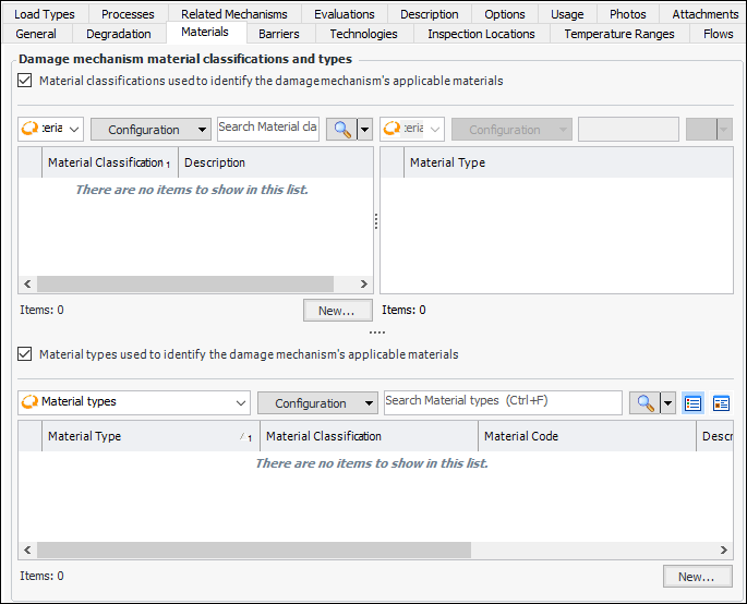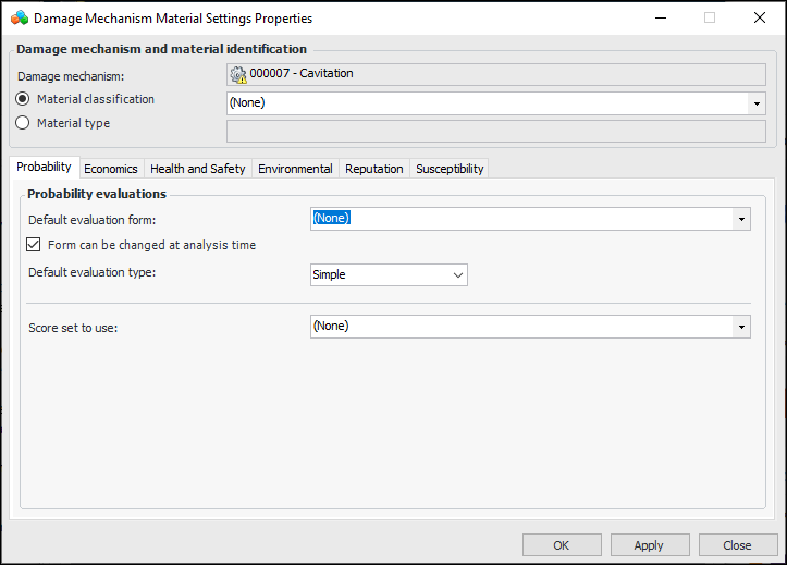 2. Select Material classifications used to identify the damage mechanism’s applicable materials, if appropriate. Material classifications provide broad categories of materials (for example, Stainless Steel) that are associated with specific material types (for example, High Chromium Stainless Steel) with a standard material code to identify the type.