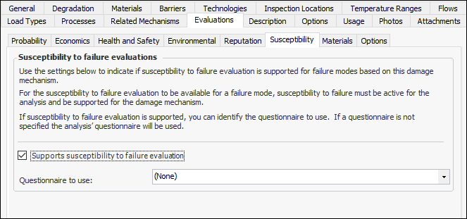 6. Select the Susceptibility tab. Susceptibility to failure evaluation provides an alternative to probability of failure analysis for assets prone to degradation that is not age-related.