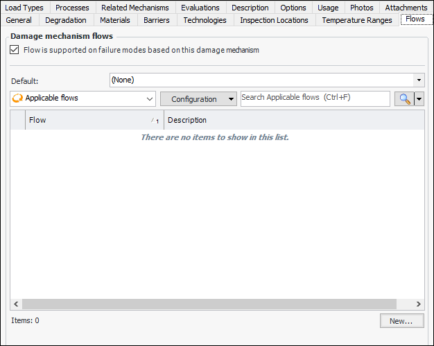 1. In the Failure Mode window, select the Flows tab. Flow is an aspect of the operating environment in which the damage mechanism is prone to occur. Examples are motionless-static and hydrodynamic.Note: To prevent flow conditions from being selected on failure modes created from the library entry, clear Flow is supported.