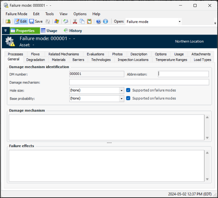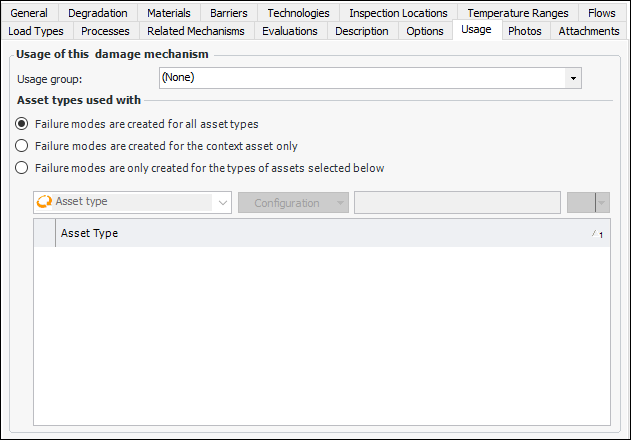 1. In the Failure Mode window, select the Usage tab to assign a usage group to the library entry and specify the asset types it can be used with.